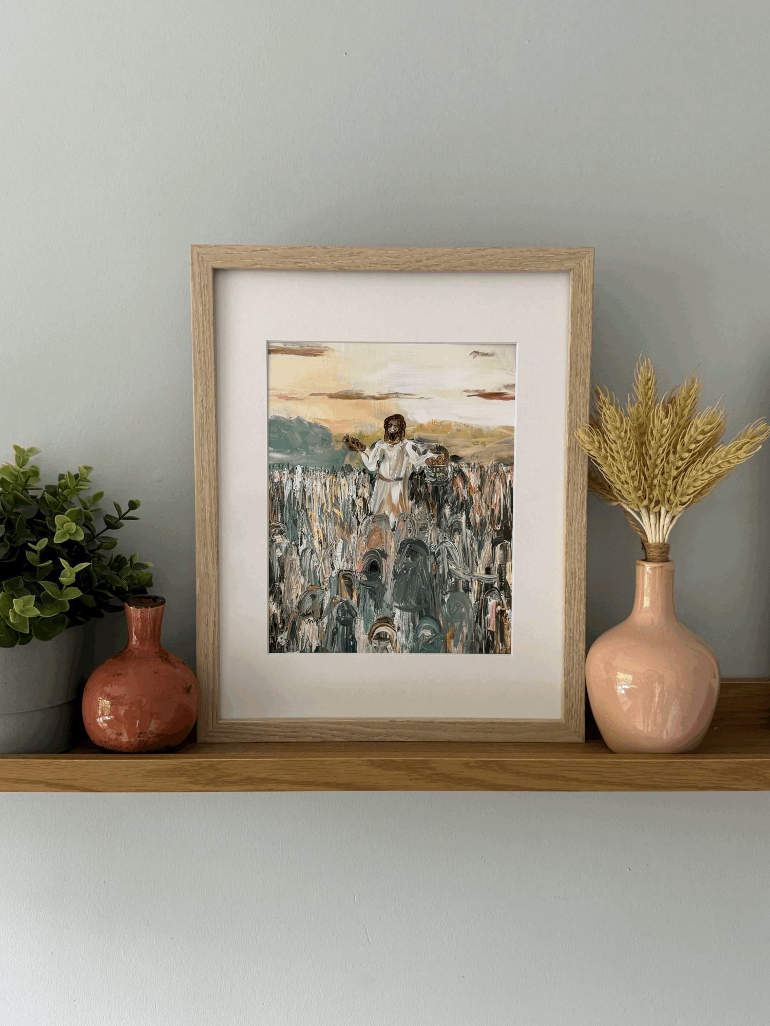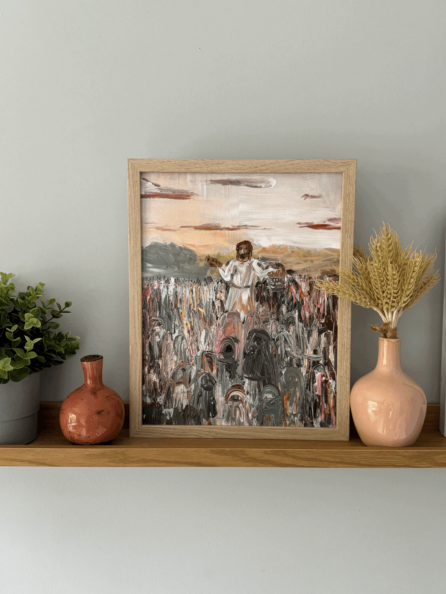 This abstract painting is based off of when Jesus fed a crowd of 5000 with 5 loaves of bread and 2 fish. The original painting was created with acrylic paint.